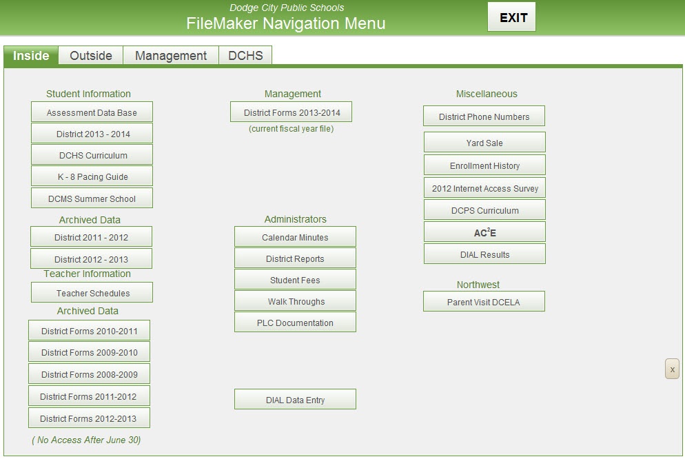 Wipf said he selected FileMaker as the base for Dodge City Public Schools' custom database solution centered on his familiarity with the product and its capabilities. "I know how to program and I've used FileMaker a number of times in the past," stated Wipf. "When the district approved the budget to purchase a license for the product, FileMaker was installed on all desktops and laptops. A lot of districts don't like to touch every computer in order to install software," said Wipf, "but we decided the value of doing that would be justified."
